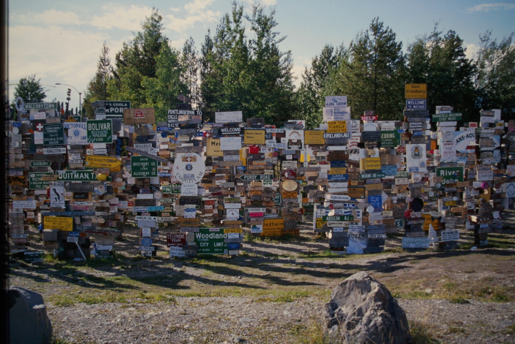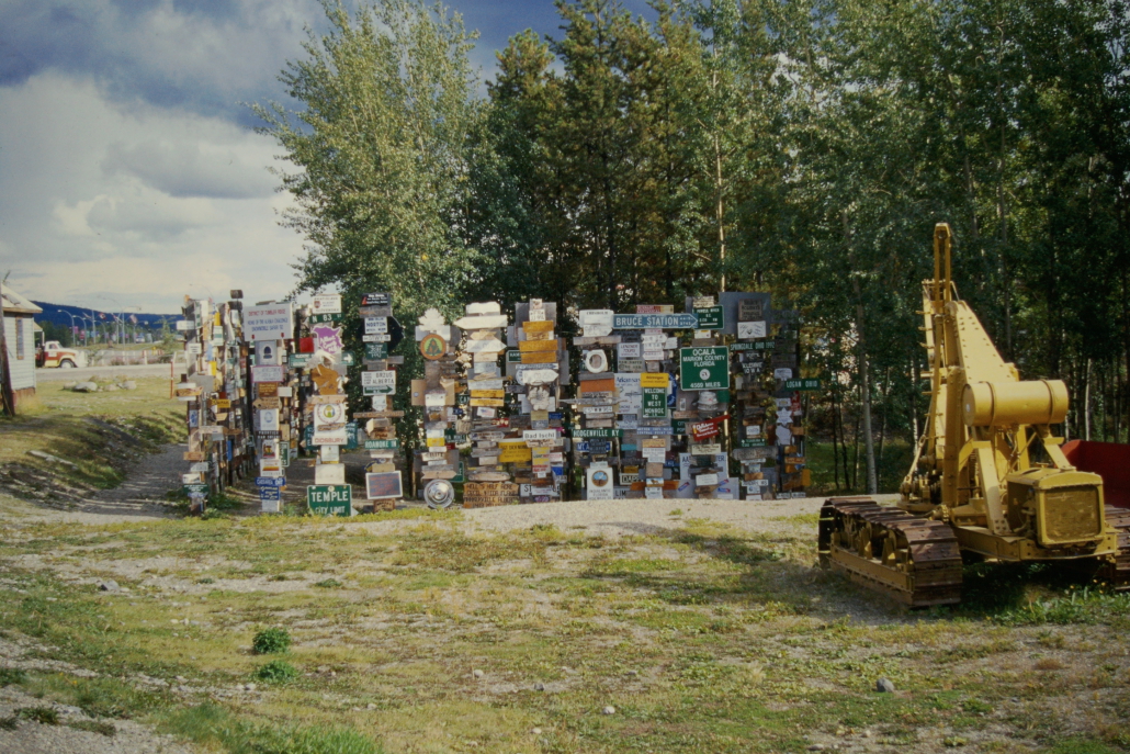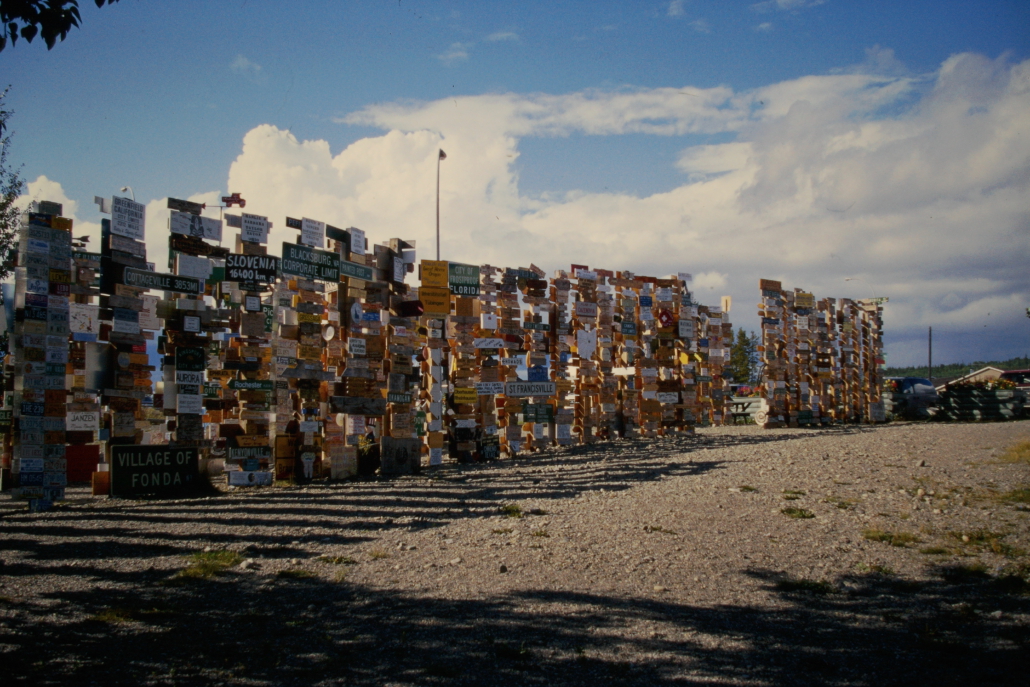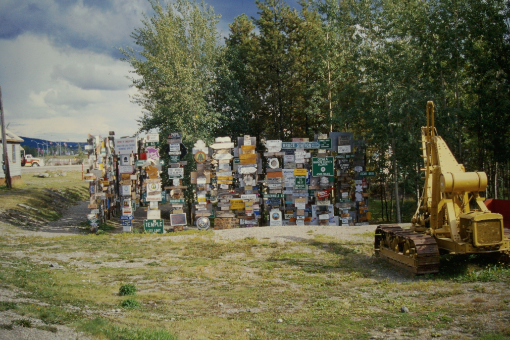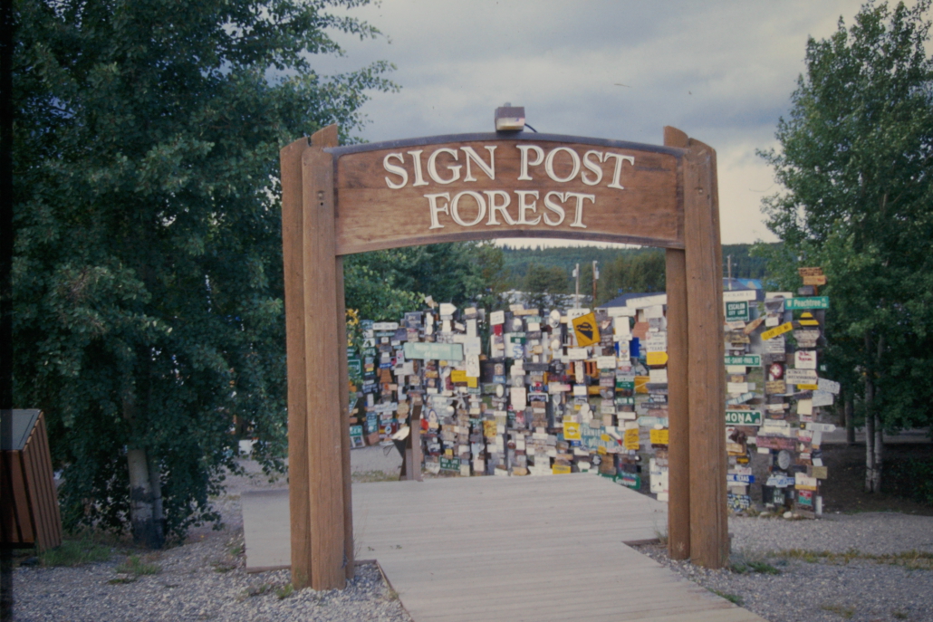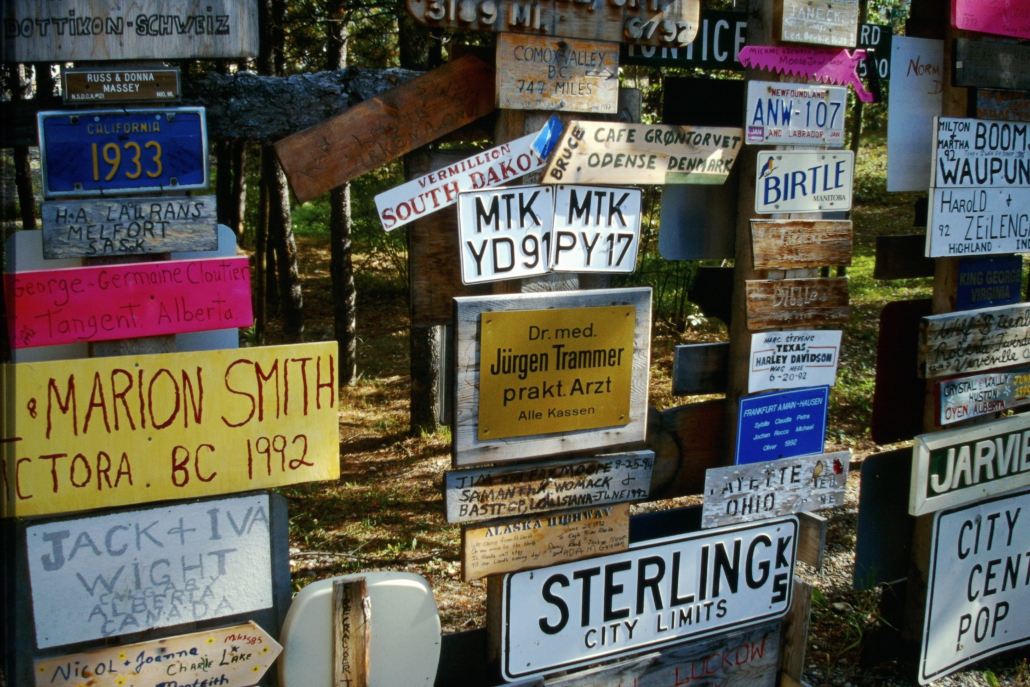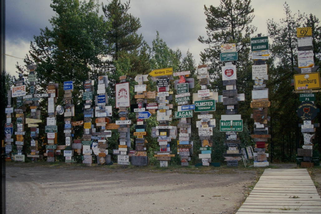 Der Sign Post Forest in Watson Lake, Yukon ist ein Freilicht-Museum aus zehntausenden Ortsschildern, Kennzeichen und Wegweisern aus aller Welt. Besucher können ihre eigenen Schilder anbringen – deshalb wächst die Sammlung ständig weiter. Heute stehen dort über 80.000 Schilder.