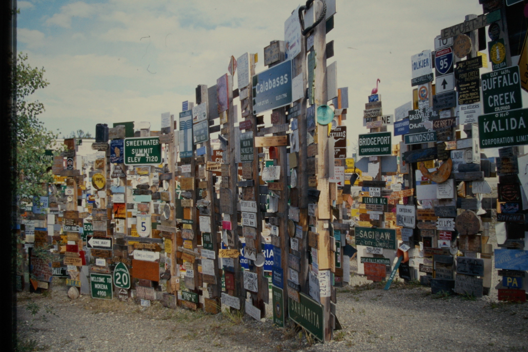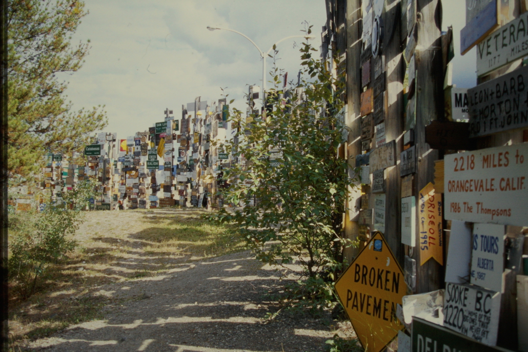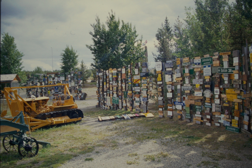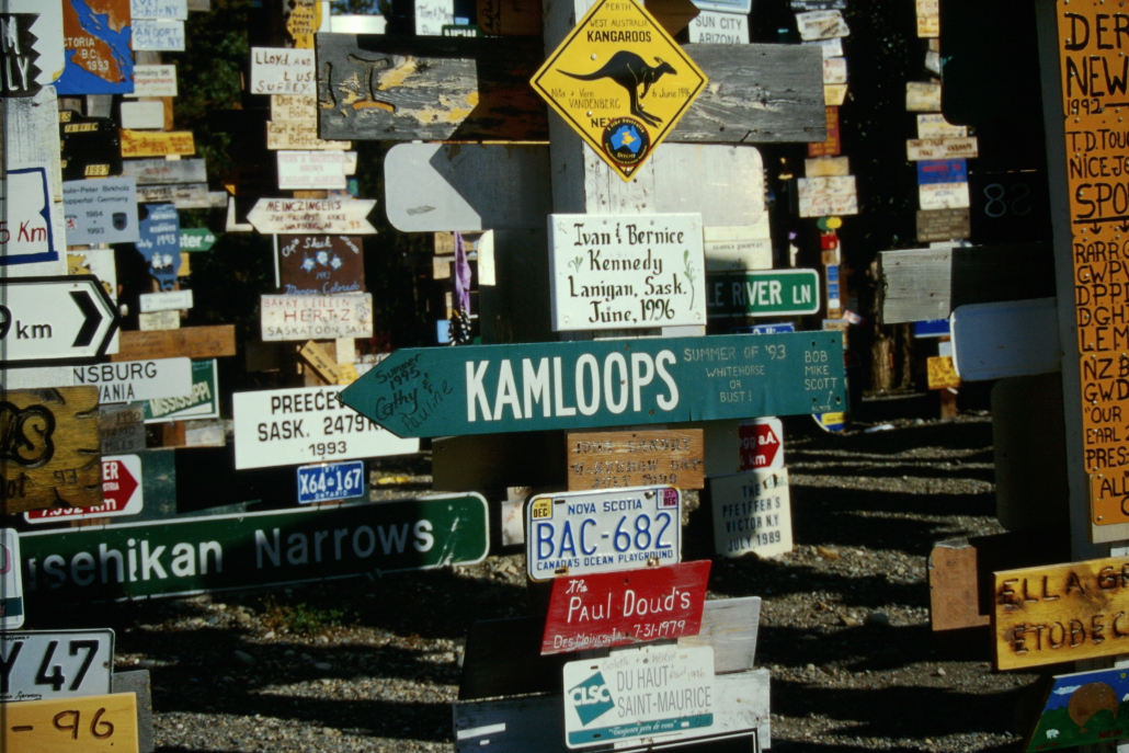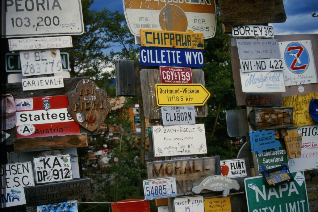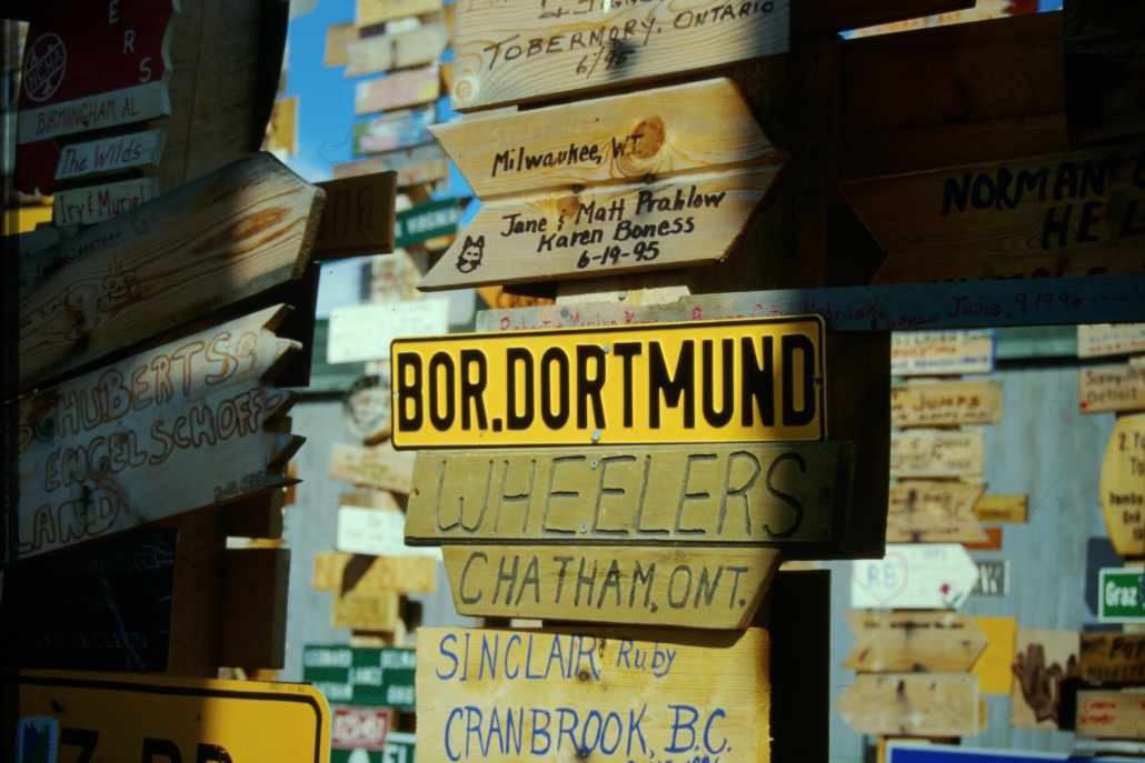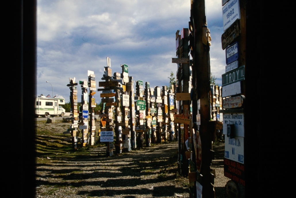 Der Sign Post Forest in Watson Lake, Yukon ist ein Freilicht-Museum aus zehntausenden Ortsschildern, Kennzeichen und Wegweisern aus aller Welt. Besucher können ihre eigenen Schilder anbringen – deshalb wächst die Sammlung ständig weiter. Heute stehen dort über 80.000 Schilder.